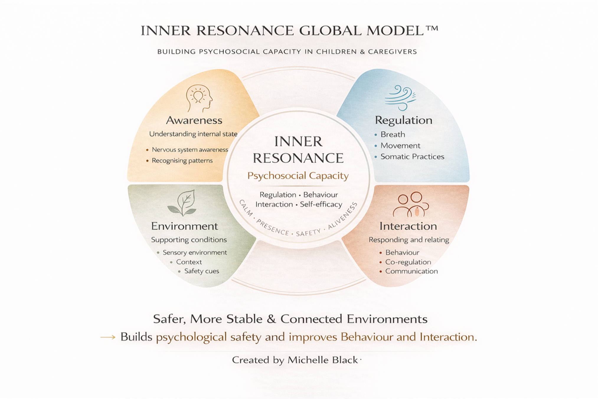 It integrates four domains — awareness, regulation, interaction, and environment — to drive measurable improvements in behaviour, interaction, and emotional regulation in real-world settings.